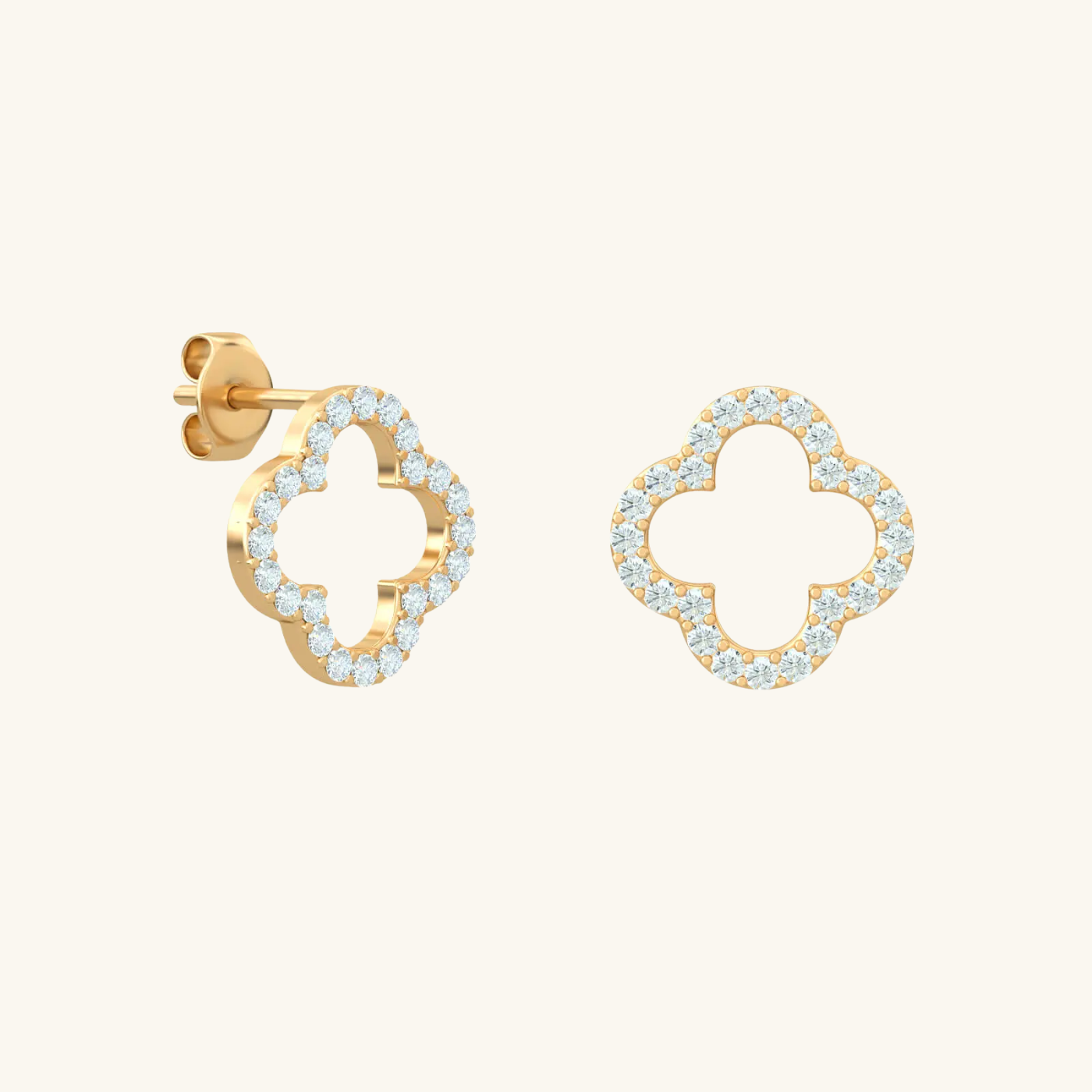 Boucles d’oreilles en or jaune 18 carats, délicatement serties en forme de trèfle ajouré. Une touche de lumière et d’élégance intemporelle.